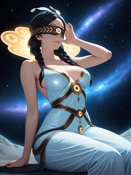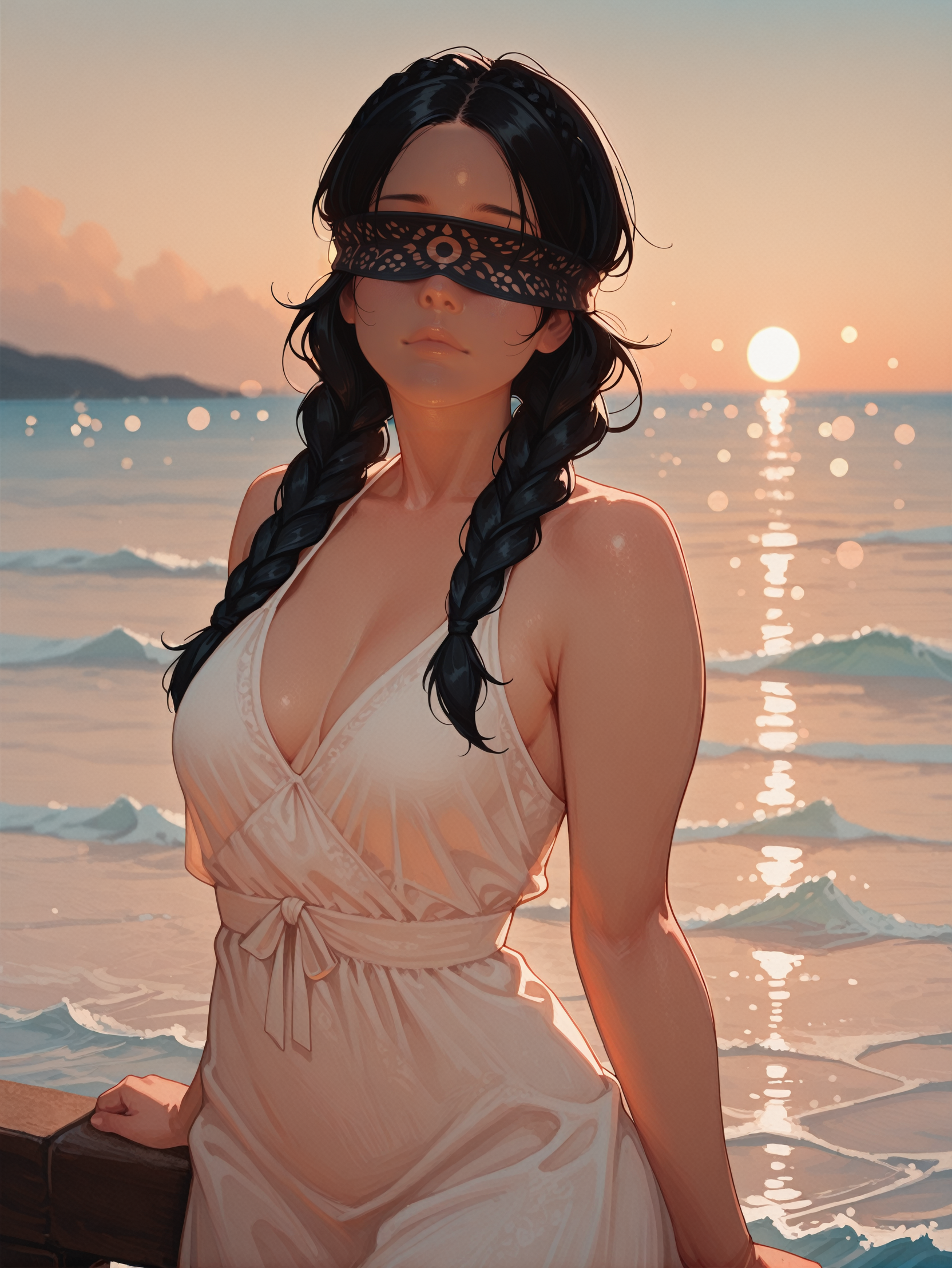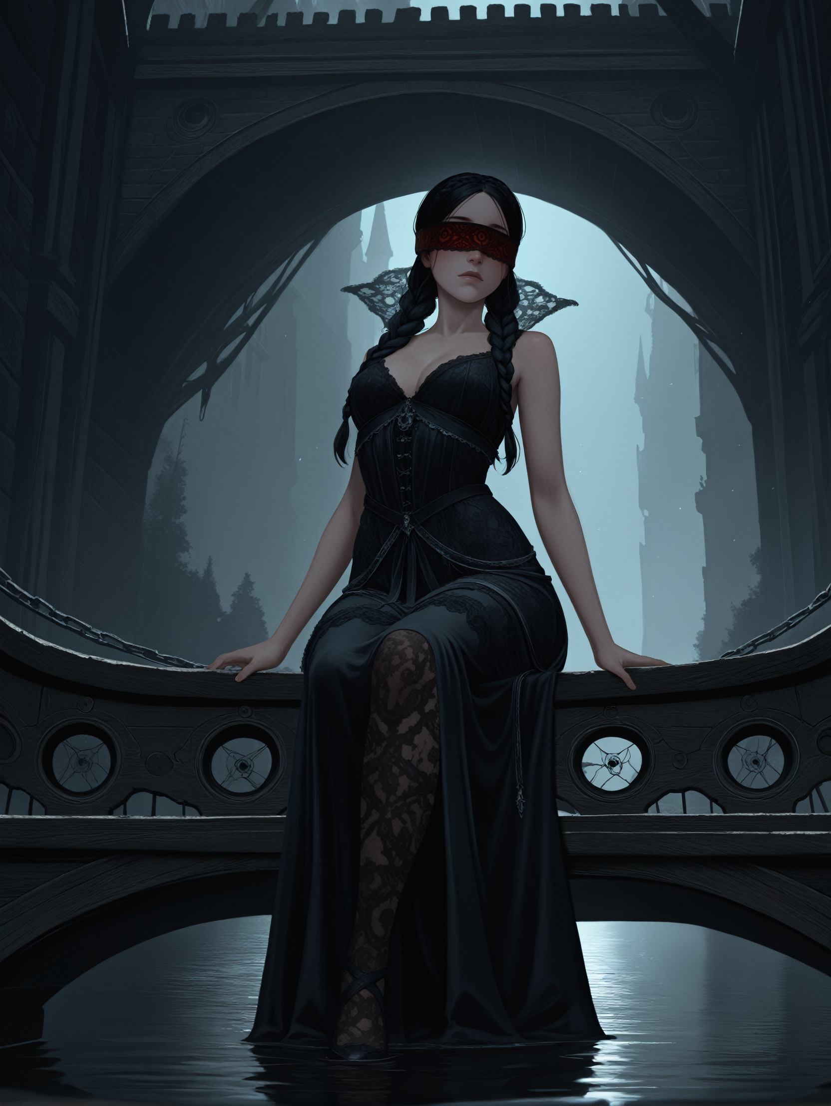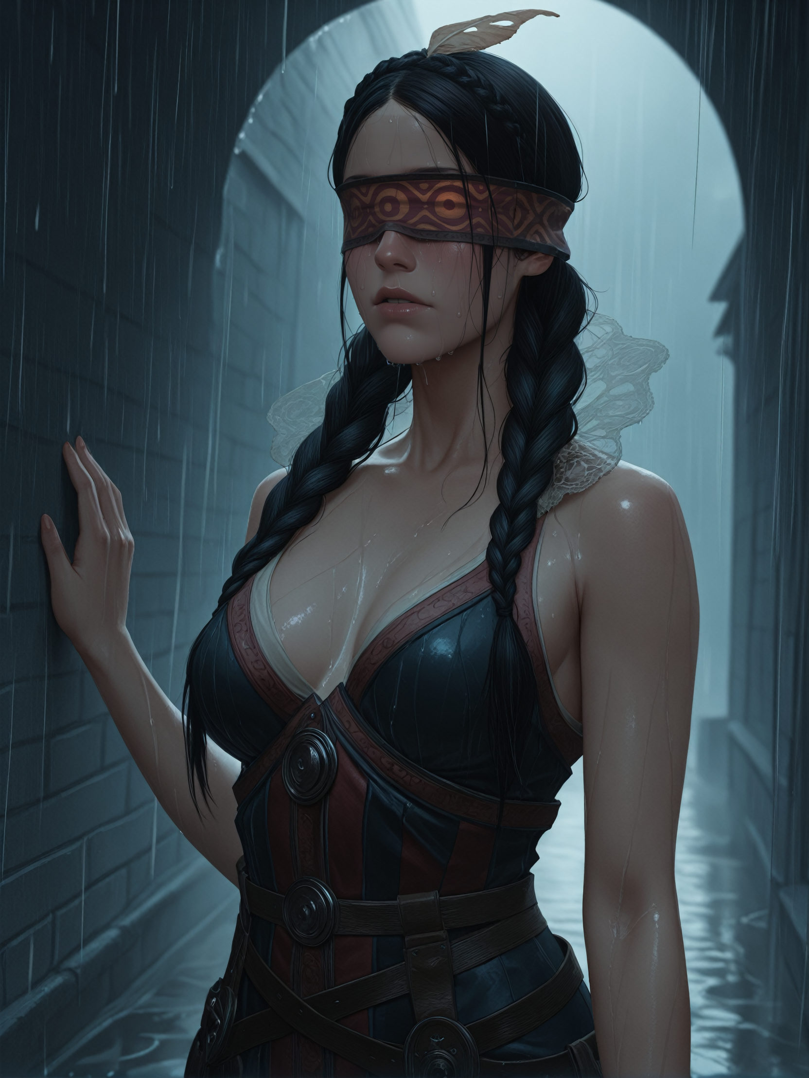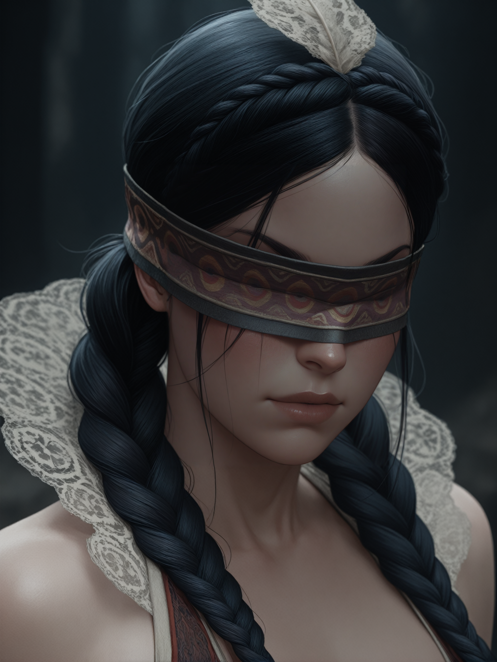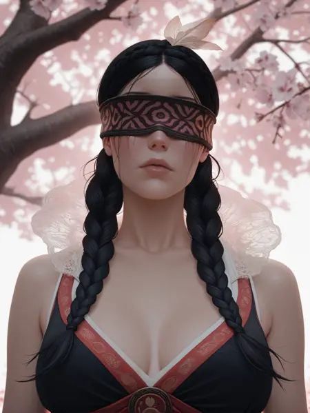 W3Philippa, 1girl, long hair, black hair, covered eyes, twin braids