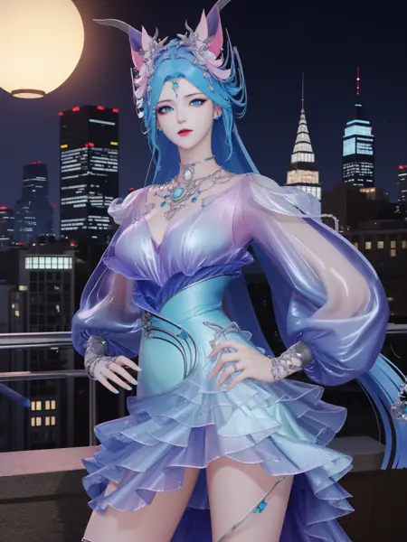 - WZRYdiaochanHQG, 1girl, blue hair, solo, dress, bare legs, long hair, blue eyes, hair ornament, looking at viewer, jewelry, high heels,necklace,puffy long sleeves, cityscape, night,