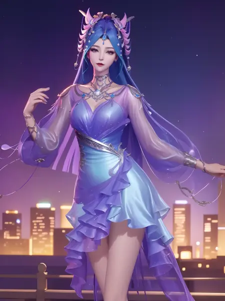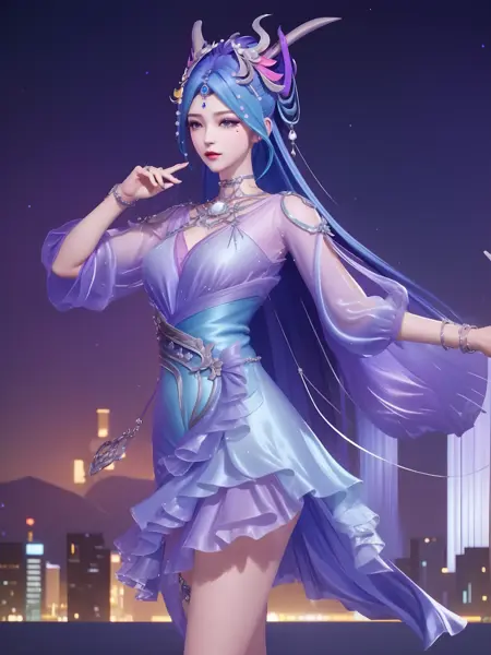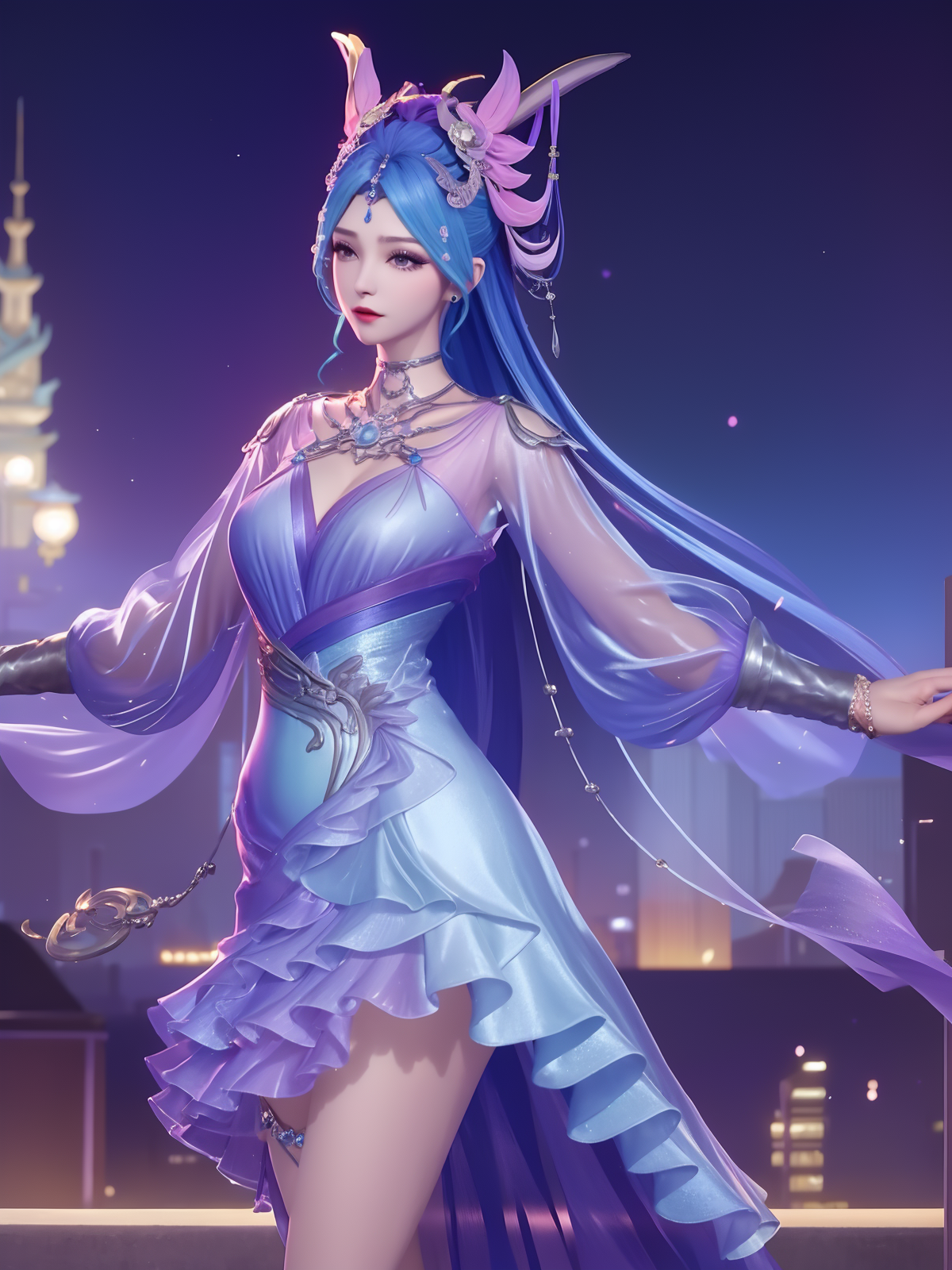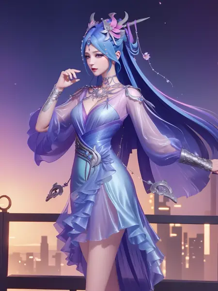 - WZRYdiaochanHQG, 1girl, blue hair, solo, dress, bare legs, long hair, blue eyes, hair ornament, looking at viewer, jewelry, high heels,necklace,puffy long sleeves, cityscape, night,