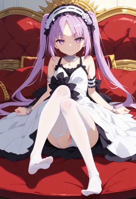 euryale (fate), hairband, purple hair, long hair, twintails, purple eyes, bare shoulders, white dress