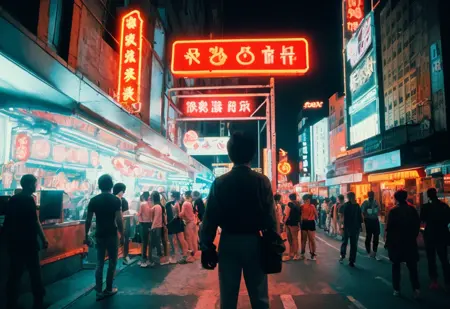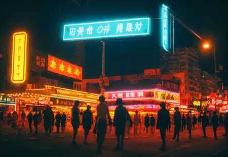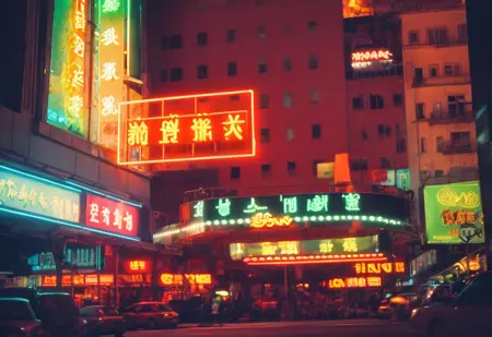 トリガー語: フィルムグレイン、高コントラスト、現実的、風景、都市、夜、ネオンライト、ネオントリム