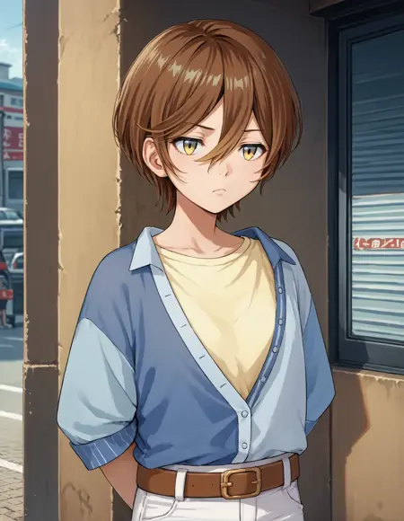 일상 복장: mgrcsasameyozuru, (노란색 티셔츠:0.9), (파란색 느슨한 셔츠), 갈색 벨트, 흰색 바지, 팔찌