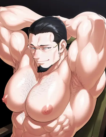 glasses, facial hair, black hair, slicked back, beard, goatee, black eyes