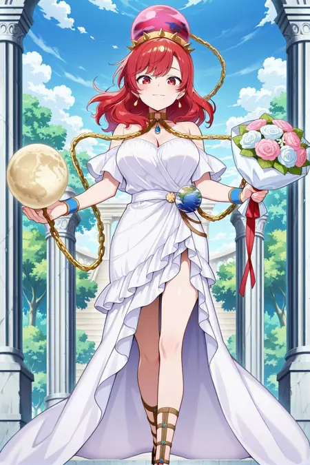 hecatia lapislazuli, 1girl, red eyes, red hair, long hair, large breasts, hecatia lapislazuli (triple white goddess), alternate costume, 头饰,带刺王冠,泪滴耳环,青铜链条,金色项圈,项链,蓝色宝石,裸露肩膀,乳沟,绳索,希腊罗马风格服饰,婚纱,白色连衣裙,荷叶边裙,可拆卸袖子,角斗士凉鞋,高跟鞋,蓝色腕带,手持花束,手持权杖,金色权杖,大地(装饰),月亮(装饰),冥界(装饰),