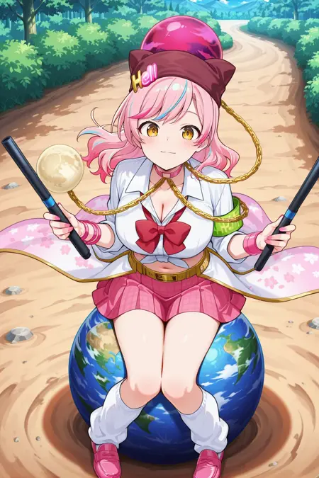hecatia lapislazuli, 1girl, yellow eyes, pink hair, long hair, streaked hair, blue hair, large breasts,, hecatia lapislazuli (goddess of the flower garden hell), alternate costume, 替代发色,棕色头巾,发饰,地狱发饰,粉色项圈,红色蝴蝶结,松散蝴蝶结,白色上衣,有领衬衫,肚脐,锁骨,乳沟,绿色臂章,粉色手环,腰间斗篷,白色斗篷,金色腰带,粉色裙子,百褶裙,格子裙,白色腿套,粉色鞋子,乐福鞋,金链,手持,伸缩警棍,指甲,粉色指甲,大地(装饰),粉色月亮(装饰),冥界(装饰),