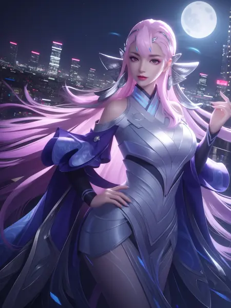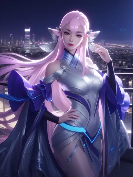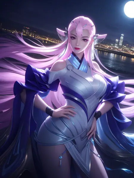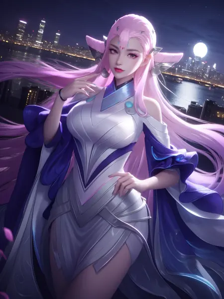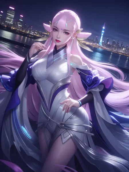 - WZRYdiaochanMYHW, 1girl, long hair, solo, pink hair, dress, hair ornament, bangs, looking at viewer, long sleeves,shiny,wide sleeves, bare shoulders,,cityscape, night,pool,double bun, makeup,red eyelashes,mature female, cowboy shot,