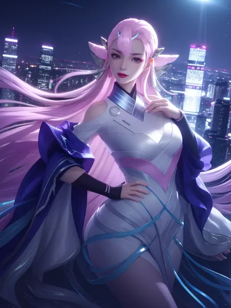 - WZRYdiaochanMYHW, 1girl, long hair, solo, pink hair, dress, hair ornament, bangs, looking at viewer, long sleeves, shiny, wide sleeves, bare shoulders, cityscape, night, pool, double bun, makeup, red eyelashes, mature female, cowboy shot,