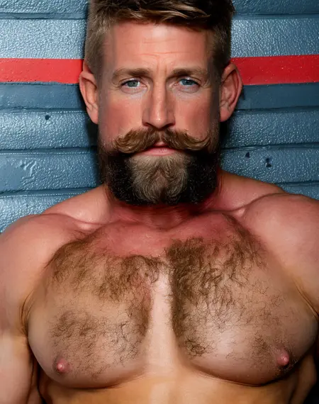 masterpiece, best quality, highres, realistic, chris redfield, body hair, blush, sweaty skin, muscle, pec cleavage, large pectorals, big butt, butt crack, small hips, nose blush, ear studs, large nipples, wearing jockstrap, looking at viewer, annoyed look, photorealistic, skin detail, bara, glans, intricate depth of field lockerroom background, looking at viewer, sweaty shiny skin, michael downs, homoerotic, ratemycock, onlyfans