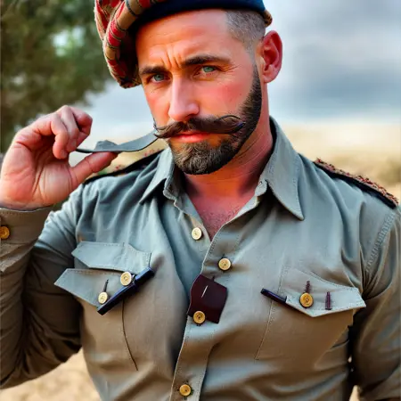masterpiece, best quality, highres, realistic, 1boy, male focus, solo, realistic, camouflage, military, uniform, brown eyes, looking at viewer, facial hair, upper body, black hair, smile, shirt, grey background, stubble, simple background, brown hair, short hair