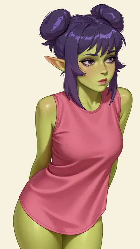 ローラ:Lola \(vk\), 1girl, solo, shirt, purple eyes, purple hair, pointy ears, hair bun, black eyes, double bun, colored skin, pink shirt, green skin, sidelocks, sleeveless
