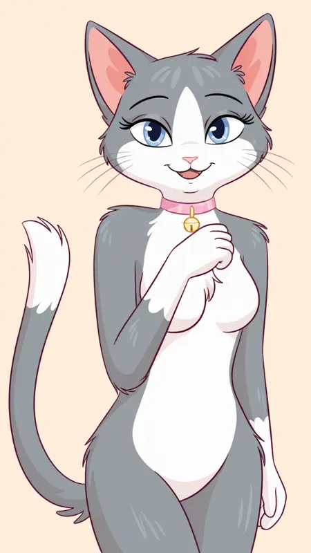アンフィサ:Anfisa \(vk\), animalization, 1girl, solo, animal ears, cat ears, cat girl, furry female, body fur, white fur, animal nose, two-tone fur, grey fur, blue eyes, happy, collar, tail, half-, hand up, cat, choker, animal, no humans
