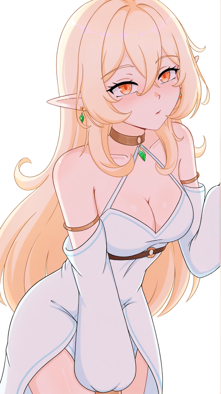 アイリス:Ayris \(vk\), 1girl, solo, long hair, blonde hair, hair between eyes, jewelry, earrings, pointy ears, orange eyes, breasts, dress, cleavage, bare shoulders, detached sleeves, white dress, elf, white sleeves, long sleeves, choker,