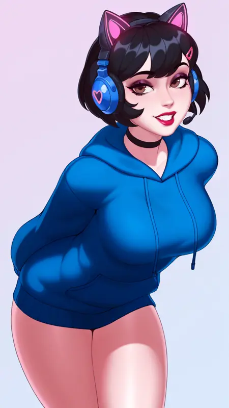 アーネーチカ:Anechka \(vk\), 1girl, solo, breasts, short hair, black hair, hair ornament, animal ears, brown eyes, teeth, choker, hairclip, hood, cat ears, fake animal ears, hoodie, black choker, headphones, hood down, headset, blue hoodie, animal ear headphones, cat ear headphones, makeup, lipstick