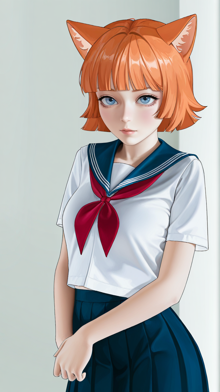 アイコちゃん:Ayko-chan \(vk\), 1girl, solo, short hair, blue eyes, shirt, animal ears, school uniform, white shirt, short sleeves, serafuku, blunt bangs, sailor collar, orange hair, blue sailor collar, cat ears,