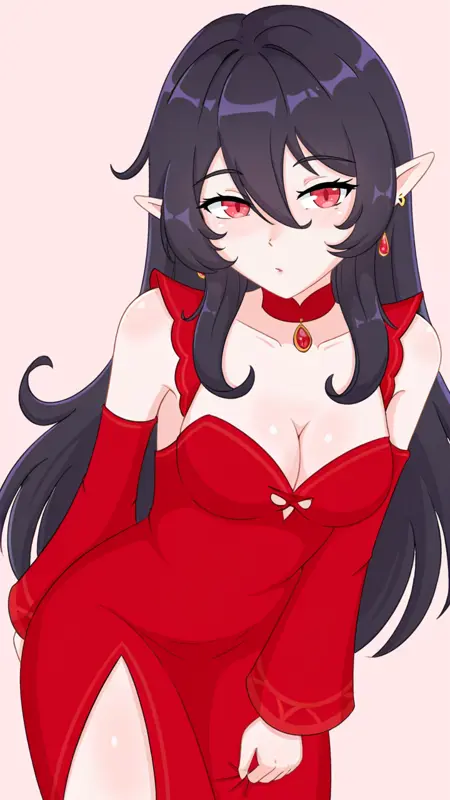 アイリス(代替):Ayris \(vk\), official alternate design, 1girl, solo, long hair, breasts, black hair, red eyes, dress, hair between eyes, cleavage, jewelry, earrings, pointy ears, red dress, detached sleeves, choker, red choker,