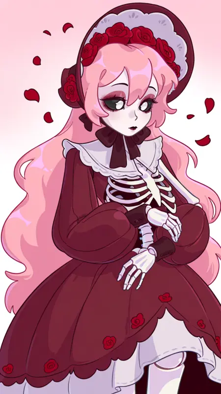 ボニー:Bony \(vk\), monsterification, 1girl, solo, long hair, long sleeves, dress, pink hair, flower, puffy sleeves, hair flower, makeup, rose, red flower, puffy long sleeves, eyeshadow, colored sclera, red rose, black sclera, joints, white eyes, bonnet, skeleton, doll joints, hat, very long hair, petals, hat flower,
