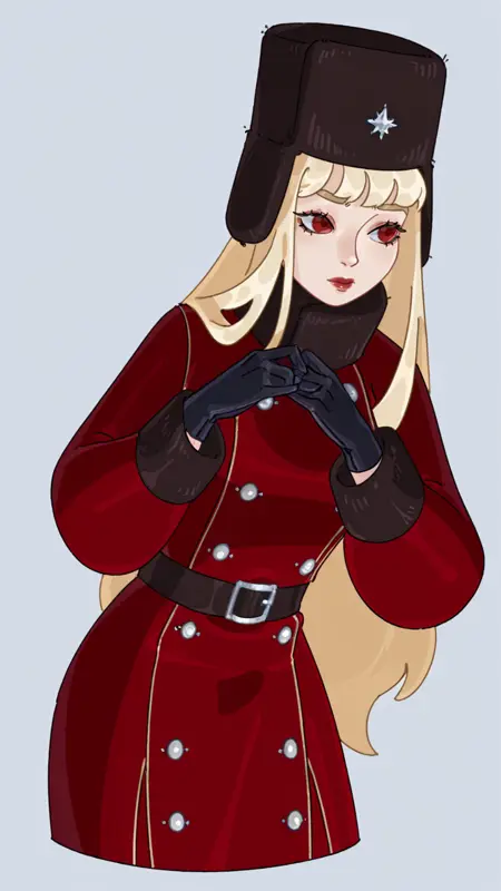 バリニャ・ソボリナ:Sobolina \(vk\), 1girl, long hair, blonde hair, gloves, red eyes, hat, black headwear, fur hat, solo, ushanka,