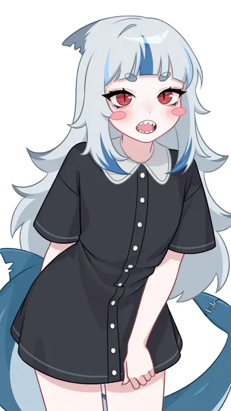 アル:Alu \(vk\), 1girl, solo, long hair, red eyes, blue hair, grey hair, short sleeves, teeth, blunt bangs, blush stickers, sharp teeth, slit pupils, short eyebrows, fins, fish tail, shark tail, shark girl, shirt, multicolored hair, buttons, thick eyebrows, dress, streaked hair, tail, black dress
