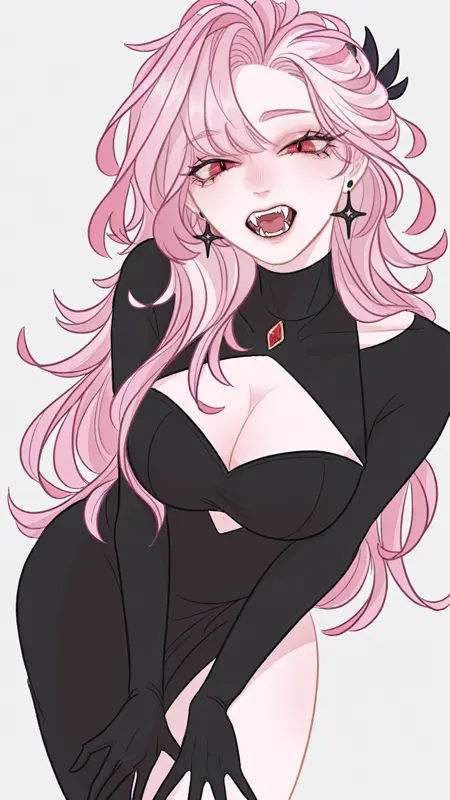 バイヴィ:Vayvi \(vk\), 1girl, solo, long hair, breasts, gloves, red eyes, jewelry, pink hair, earrings, black gloves, clothing cutout, fangs, cleavage cutout,