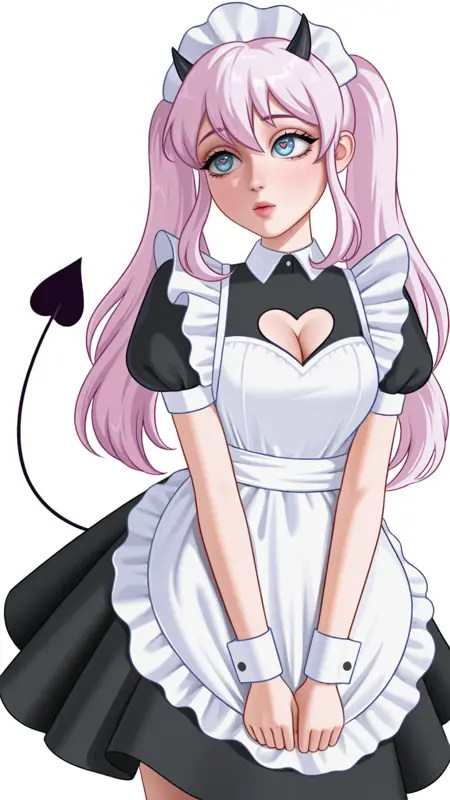 アレクサ:Alexa \(vk\), 1girl, solo, long hair, twintails, tail, pink hair, horns, apron, wrist cuffs, maid, clothing cutout, maid headdress, cleavage cutout, demon girl, demon horns, white apron, demon tail, maid apron, heart cutout, blue eyes, dress, purple hair, short sleeves, heart, puffy sleeves, black dress, puffy short sleeves, black horns,