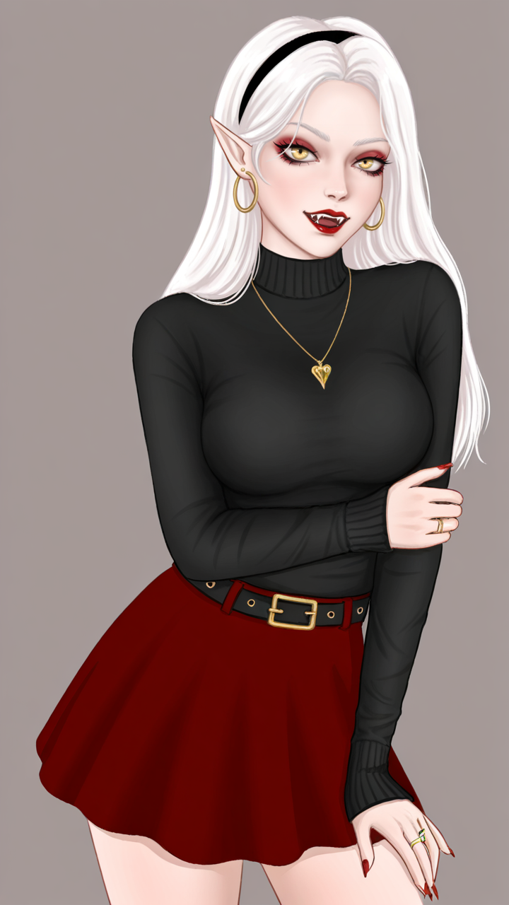 ヴァンダ:Vanda \(vk\), 1girl, solo, long hair, breasts, shirt, skirt, long sleeves, jewelry, yellow eyes, white hair, earrings, pointy ears, belt, necklace, black shirt, makeup, red skirt, ring, red nails, eyeshadow, hoop earrings, red lips, vampire, hairband, fangs, black hairband, lipstick, black sweater