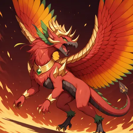 所有/更改前的华丽描述:Yharon,金色角,长尾,龙,鸟,爪,无人类,四只眼睛,羽毛翅膀,利爪,尖牙,精致的羽翼细节,红金鳞片,发光的翡翠色双眼,巨大的火焰之翼,带有橙绿羽毛