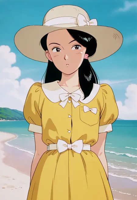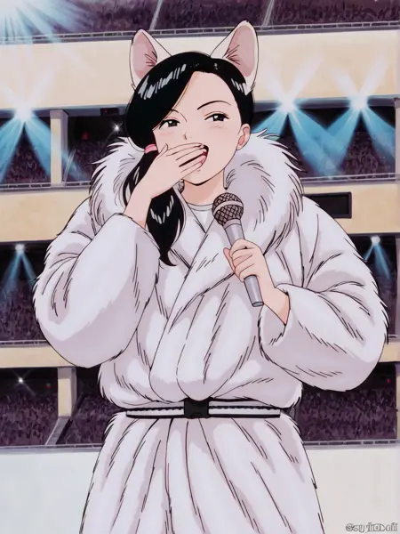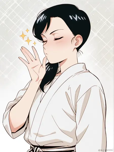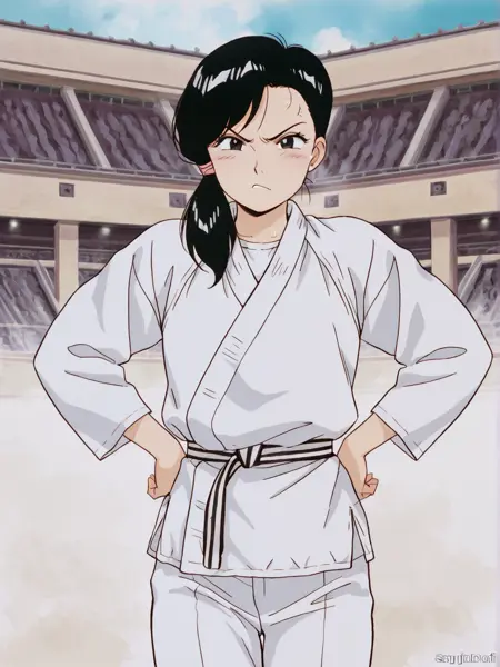マスターピース、最高品質、驚異的品質、SayHonami++、sayjudooutfit++、sideponytails、1girl、黒髪、道着、腕を組む、口を開ける、ポニーテール、レトロアートスタイル