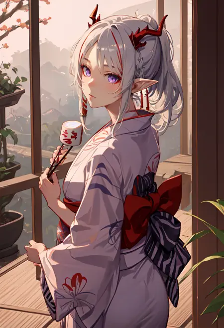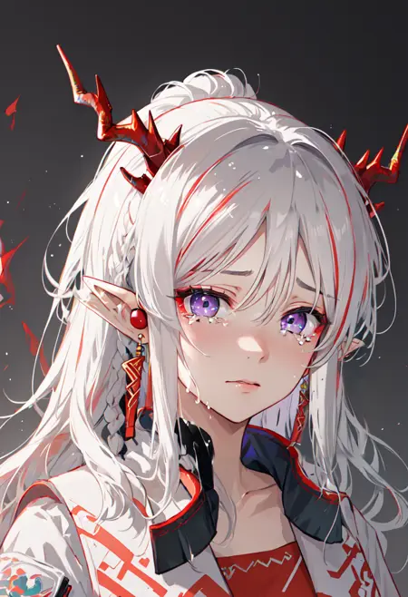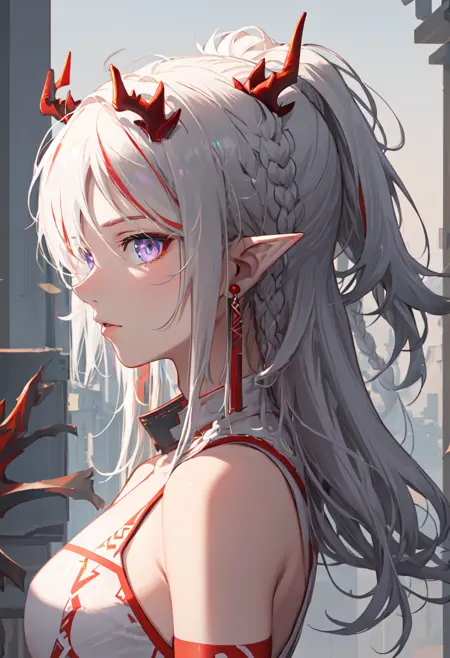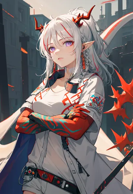 触发词为 nian_arknights,精简标签为 horns, pointy_ears, white_hair, multicolored_hair, streaked_hair, purple_eyes, red_hair, long_hair, breasts, dragon_horns, braid, tail, ponytail, earrings, colored_skin, red_skin, dragon_tail, medium_breasts。当某些特征(如发色)有时不够稳定时,您可将这些标签添加至提示词中。