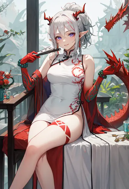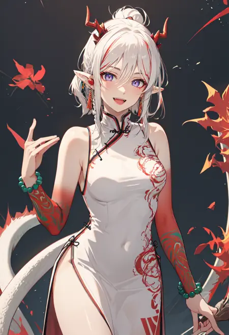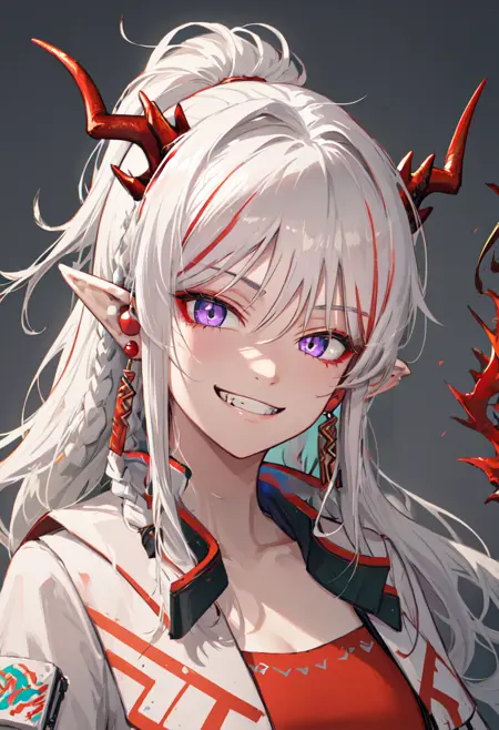 - The pruned character tags are horns, pointy ears, white hair, multicolored hair, streaked hair, purple eyes, red hair, long hair, breasts, dragon horns, braid, tail, ponytail, earrings, colored skin, red skin, dragon tail, medium breasts. You can add them into prompts when core features (e.g. hair color) of character is not so stable.