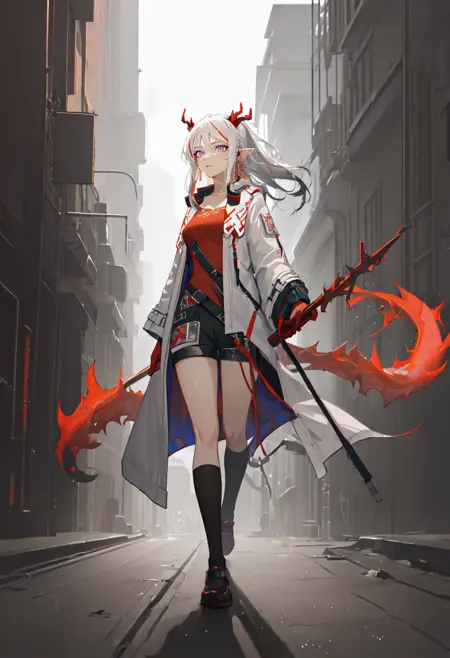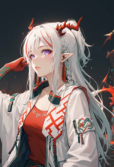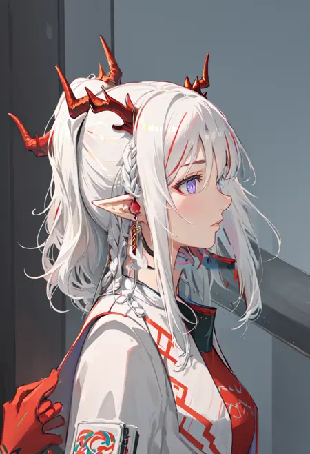 The trigger word is nian_arknights, and the pruned tags are horns, pointy_ears, white_hair, multicolored_hair, streaked_hair, purple_eyes, red_hair, long_hair, breasts, dragon_horns, braid, tail, ponytail, earrings, colored_skin, red_skin, dragon_tail, medium_breasts. When some features (e.g. hair color) are not so stable at some times, you can add these them into your prompt.