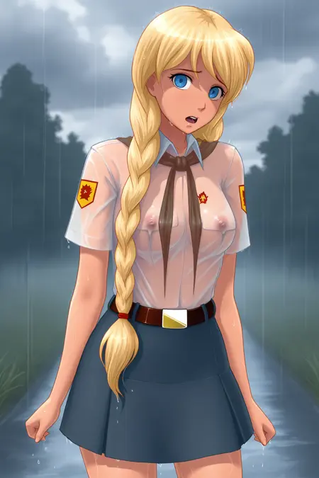 先锋服装:slaviapioneer,先锋领巾,有领衬衫,胸前口袋,短袖,腰带,铜制扣环,裙子,白袜,及膝袜,鞋子