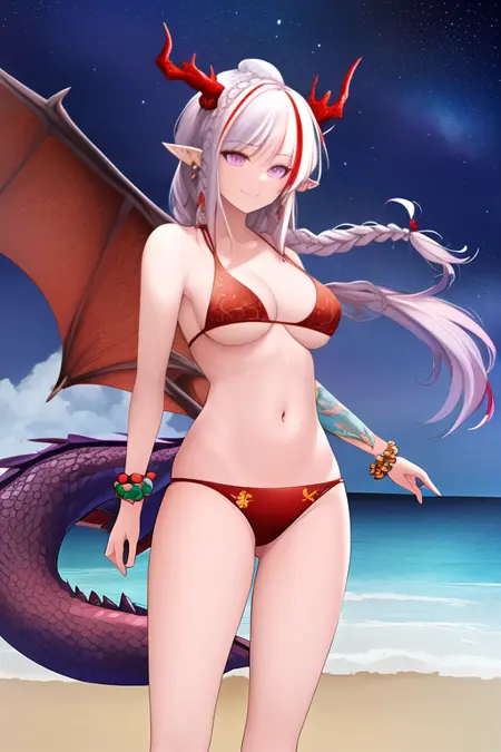 触发词为 nian_arknights,精简标签为 horns, pointy_ears, white_hair, multicolored_hair, streaked_hair, purple_eyes, red_hair, long_hair, breasts, dragon_horns, braid, tail, ponytail, earrings, colored_skin, red_skin, dragon_tail, medium_breasts。当某些特征(如发色)有时不够稳定时,您可将这些标签添加至提示词中。