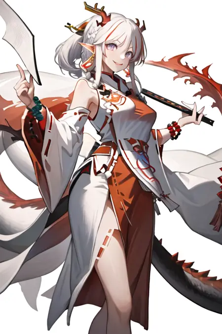 トリガーワードは nian_arknights で、削除されたタグは horns, pointy_ears, white_hair, multicolored_hair, streaked_hair, purple_eyes, red_hair, long_hair, breasts, dragon_horns, braid, tail, ponytail, earrings, colored_skin, red_skin, dragon_tail, medium_breasts です。あるとき、特定の特徴(たとえば髪の色)が安定しない場合、これらのタグをプロンプトに追加してください。