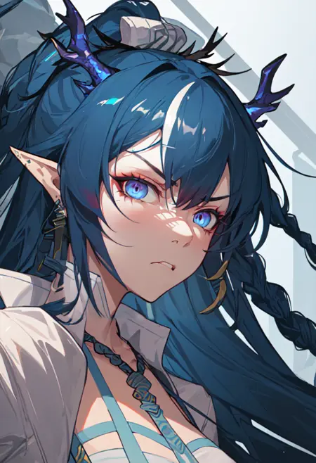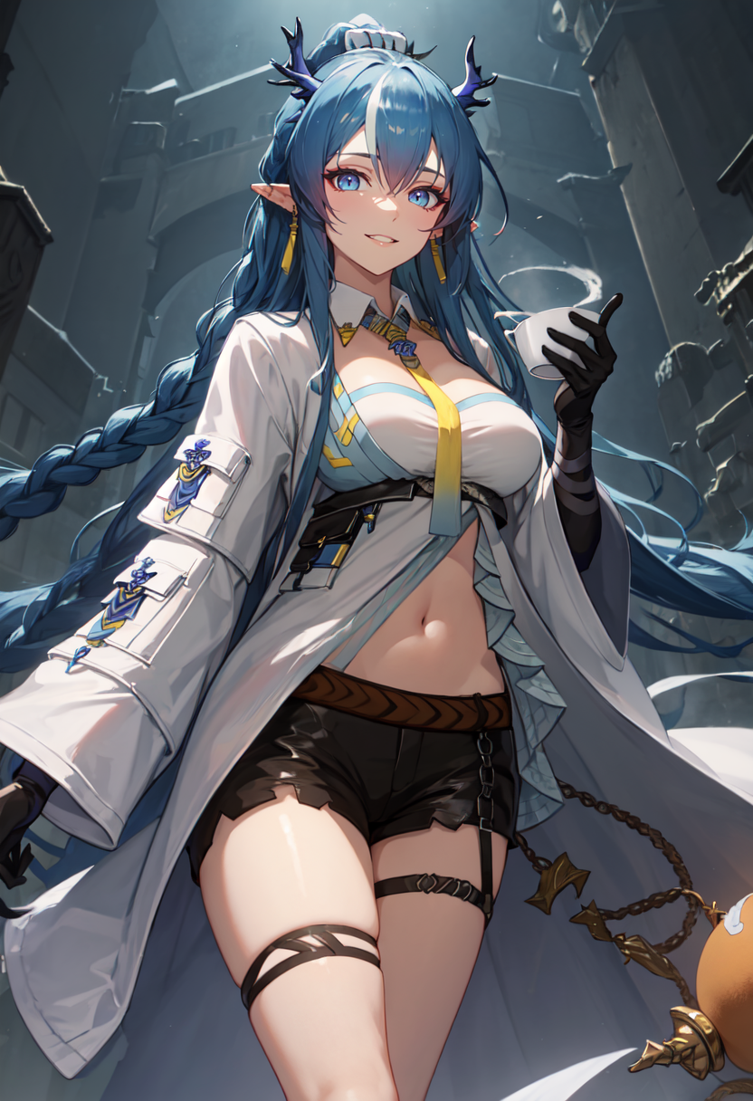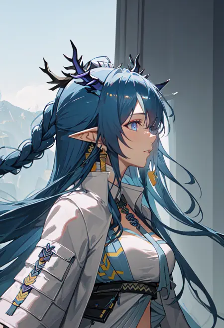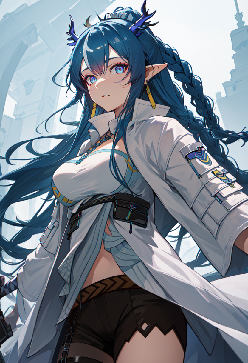 トリガーワードはling_arknights、プリューンされたタグはblue_hair, long_hair, horns, dragon_horns, pointy_ears, very_long_hair, breasts, blue_eyes, earrings, dragon_girl, braid, multicolored_hair, large_breasts, tail, dragon_tailです。一部の特徴(例:髪の色)が時々安定しない場合、これらをプロンプトに追加してください。