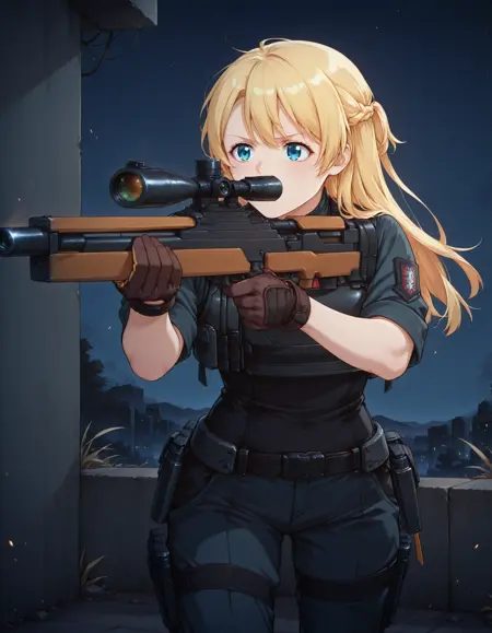 vv4zooo, sniper rifle, hand on rifle, aiming