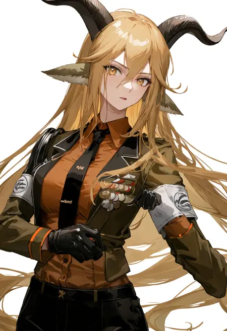 The trigger word is degenbrecher_arknights, and the pruned tags are horns, long_hair, animal_ears, blonde_hair, goat_horns, goat_ears, bangs, hair_between_eyes, yellow_eyes, very_long_hair, goat_girl, breasts, large_breasts. When some features (e.g. hair color) are not so stable at some times, you can add these them into your prompt.