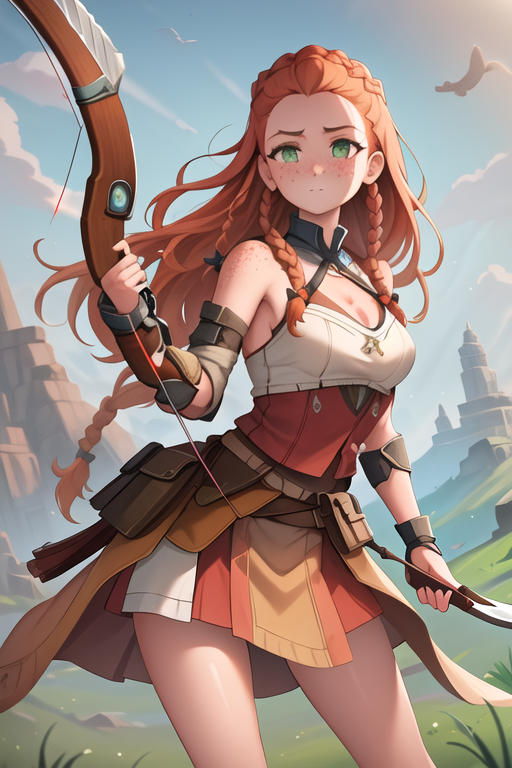 トリガー語はaloy_genshinであり、推奨タグはmasterpiece, best quality, highres, solo, {aloy_genshin:1.10}, long_hair, breasts, green_eyes, freckles, braid, orange_hair, lips, large_breasts, brown_hair, medium_breasts, 1girlです。
