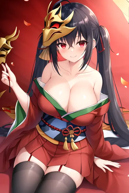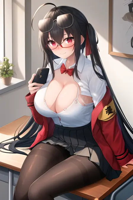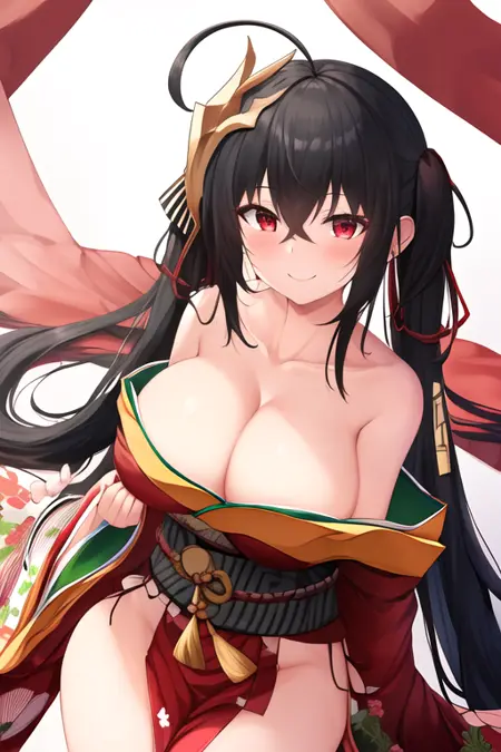The trigger word is taiho_azurlane, and the pruned tags are long_hair, black_hair, breasts, red_eyes, bangs, large_breasts, hair_between_eyes, very_long_hair, ahoge, crossed_bangs, hair_ornament, huge_breasts. When some features (e.g. hair color) are not so stable at some times, you can add these them into your prompt.
