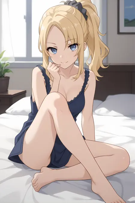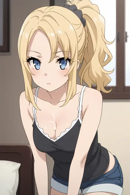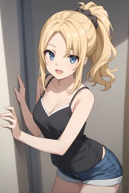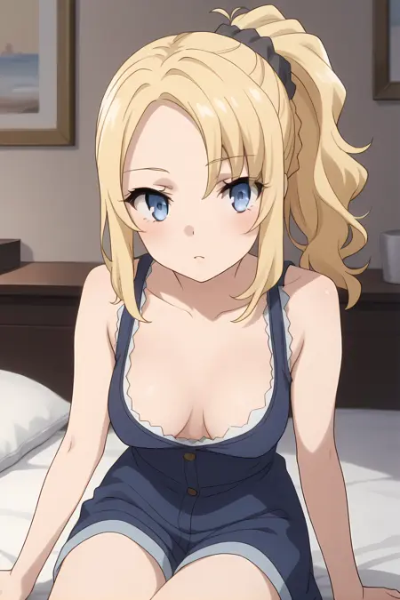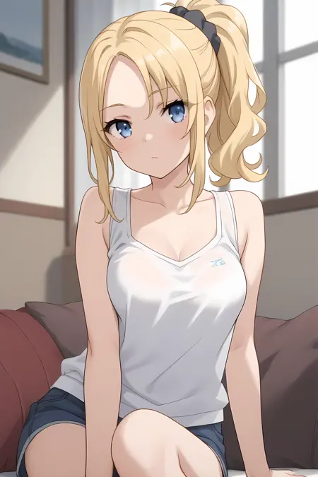 青い目、金髪、サイドロックス、ポニーテール、ヘアスクニッチ、サイドロックス、分け目のある前髪、中程度の胸