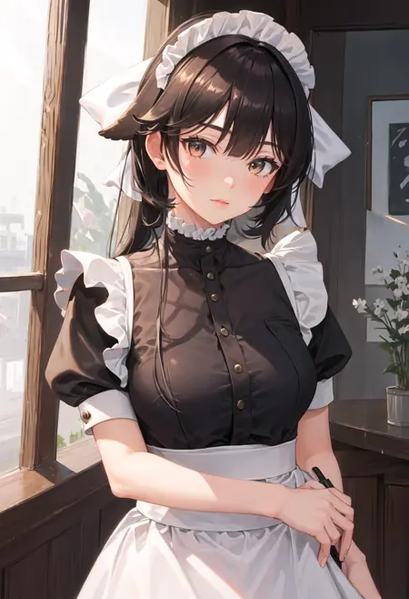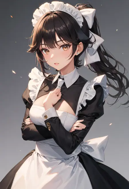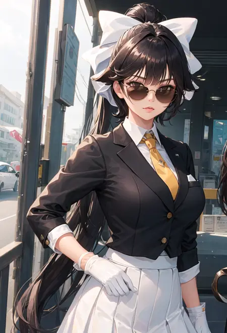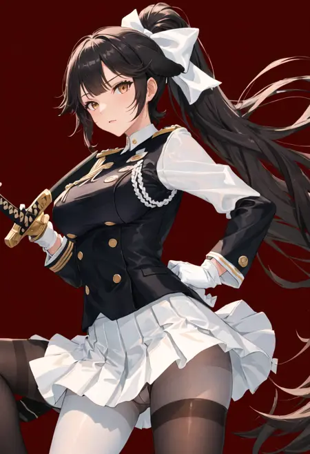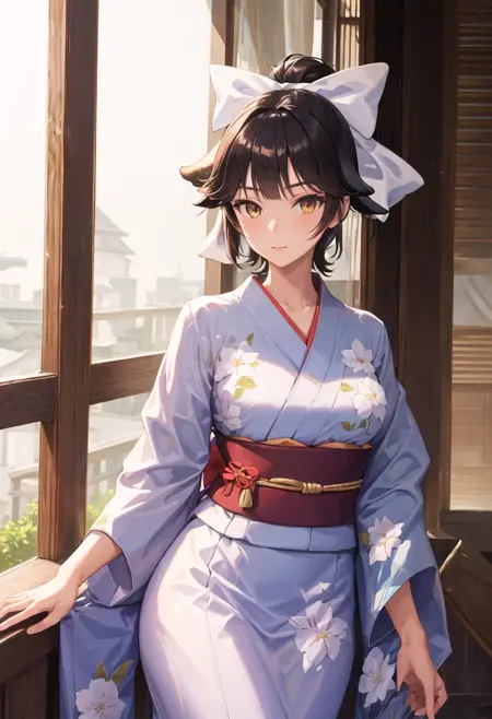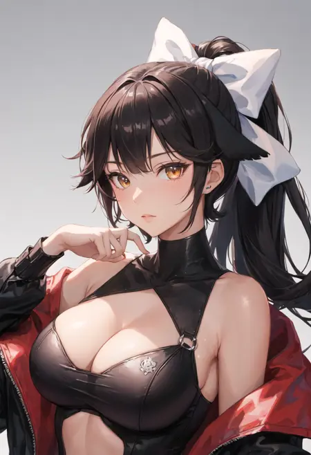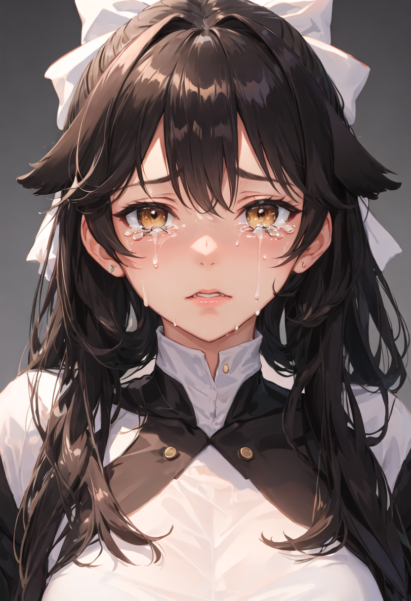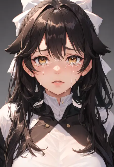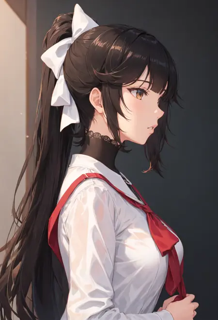 - The pruned character tags are long_hair, black_hair, breasts, large_breasts, bow, ponytail, hair_bow, white_bow, bangs, very_long_hair, brown_eyes, yellow_eyes. You can add them into prompts when core features (e.g. hair color) of character is not so stable.