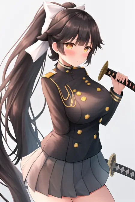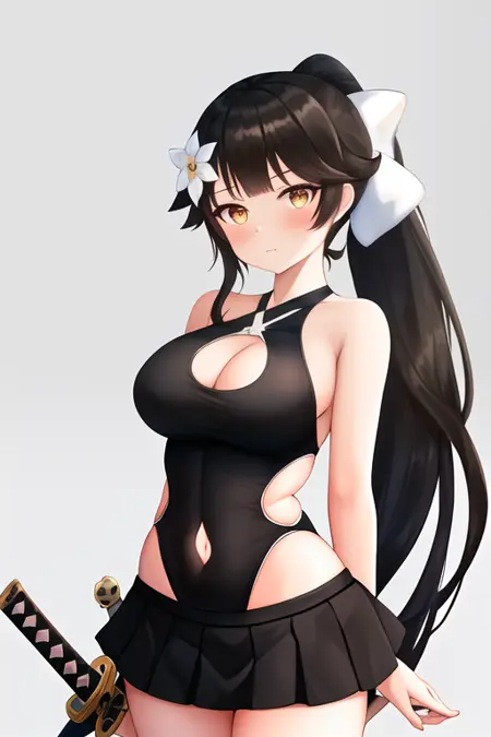 - The pruned character tags are long_hair, black_hair, breasts, large_breasts, bow, ponytail, hair_bow, white_bow, bangs, very_long_hair, brown_eyes, yellow_eyes. You can add them into prompts when core features (e.g. hair color) of character is not so stable.