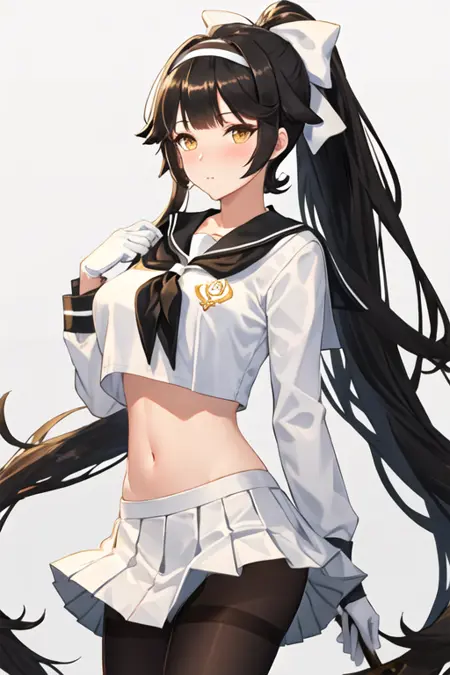 - 已精简的角色标签为:long_hair, black_hair, breasts, large_breasts, bow, ponytail, hair_bow, white_bow, bangs, very_long_hair, brown_eyes, yellow_eyes。当角色的核心特征(如发色)不够稳定时,您可以在提示词中添加这些标签。