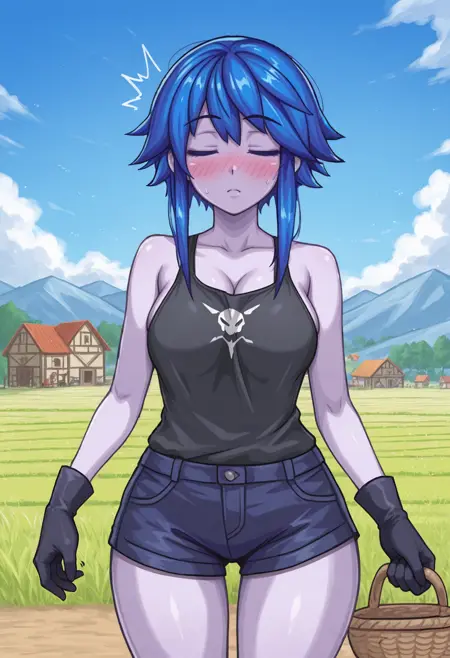 vhashley,colored skin,1girl,blue hair,solo,closed eyes,blush,spiked hair,short hair,