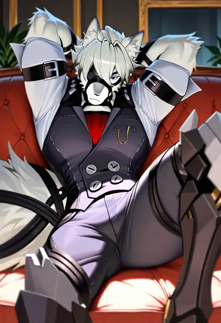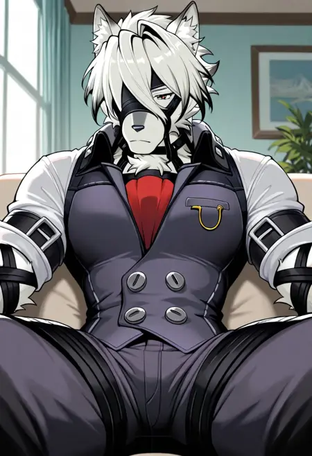 Anthro,wolf male,von lycaon,white fur,animal ears,red eyes,muscular male,muzzle,eyepatch