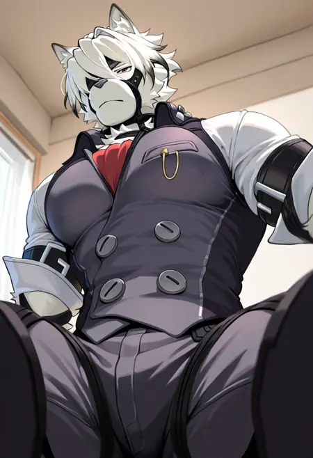 Anthro,wolf male,von lycaon,white fur,animal ears,red eyes,muscular male,muzzle,eyepatch
