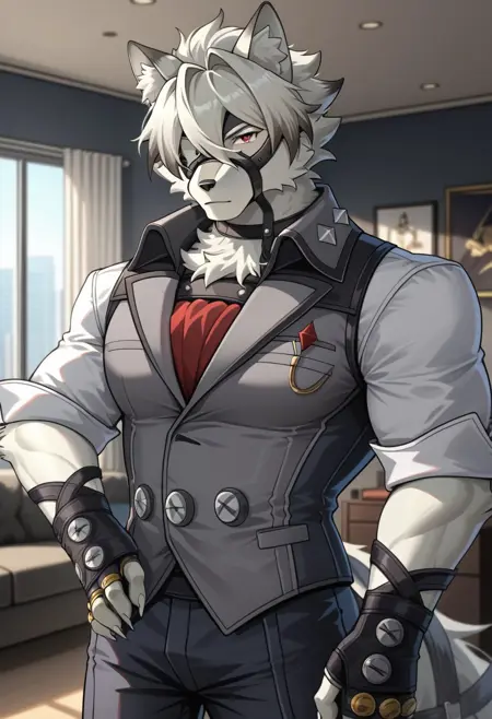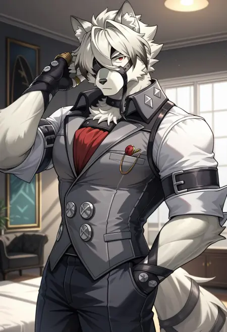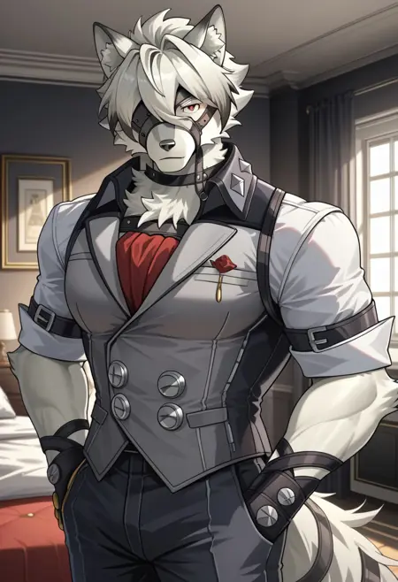 Anthro,wolf male,von lycaon,white fur,animal ears,red eyes,muscular male,muzzle,eyepatch