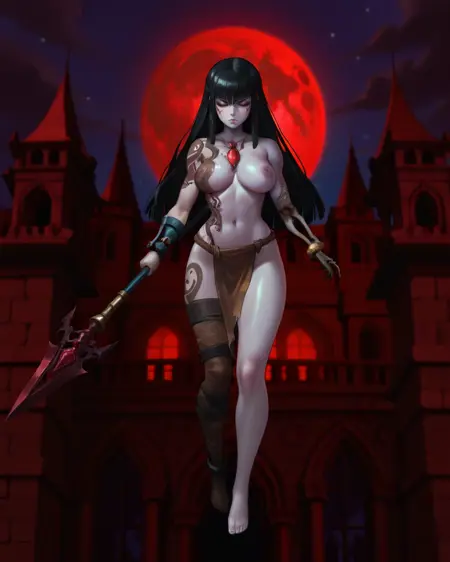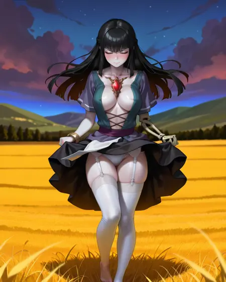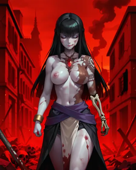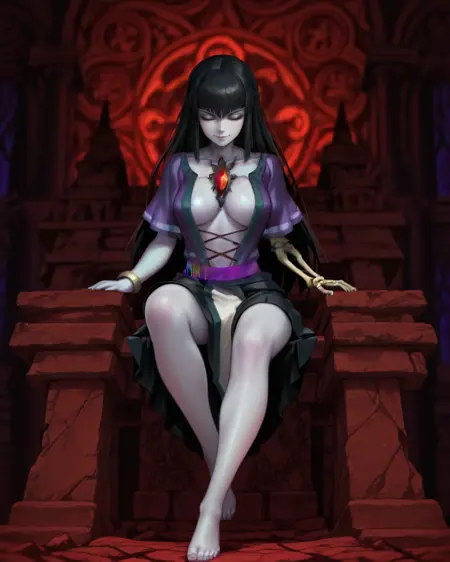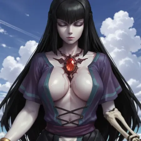 유용한 태그: 1girl, 창백한 피부, 눈 감음, 검은 머리, 히메컷, 긴 머리, 열린 셔츠, 셔츠, 십자 끈으로 단 상의, 큰 가슴, 빨간 보석, 가슴 보석, 골격 팔, 불일치한 팔, 팔찌, 배꼽, 보라색 띠, 검은 치마, 흰색 골반 커튼, 맨발