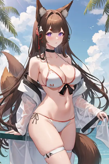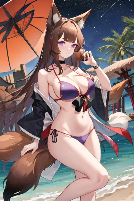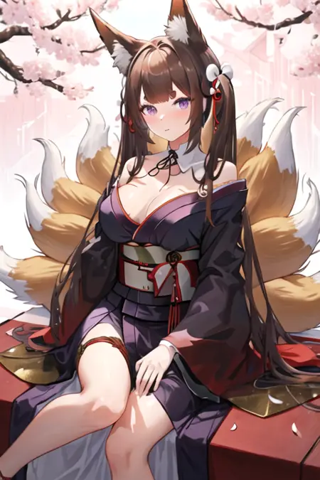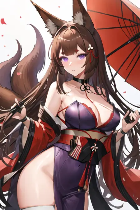 The trigger word is amagi_azurlane, and the recommended tags are best quality, masterpiece, highres, solo, {amagi_azurlane:1.15}, animal_ears, fox_ears, brown_hair, long_hair, purple_eyes, bangs, thick_eyebrows, breasts, large_breasts, animal_ear_fluff, hair_ornament, blunt_bangs, tail, fox_girl.