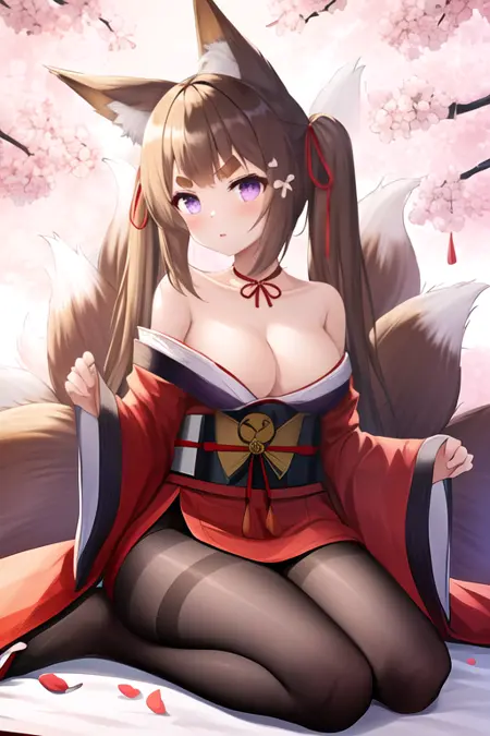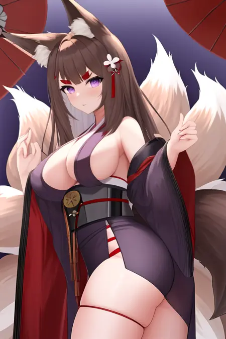 The trigger word is amagi_azurlane, and the recommended tags are best quality, masterpiece, highres, solo, {amagi_azurlane:1.15}, animal_ears, fox_ears, brown_hair, long_hair, purple_eyes, bangs, thick_eyebrows, breasts, large_breasts, animal_ear_fluff, hair_ornament, blunt_bangs, tail, fox_girl.