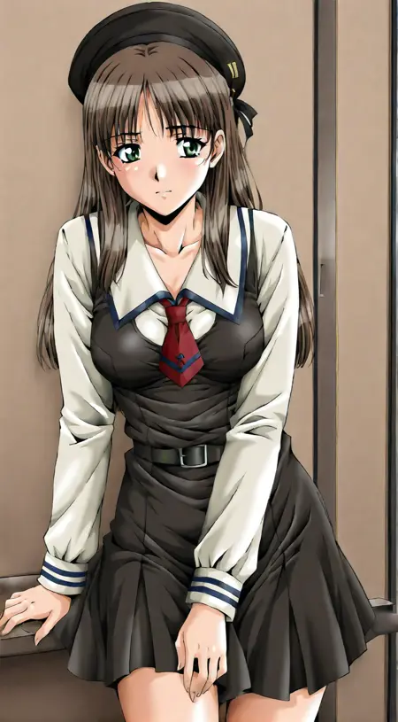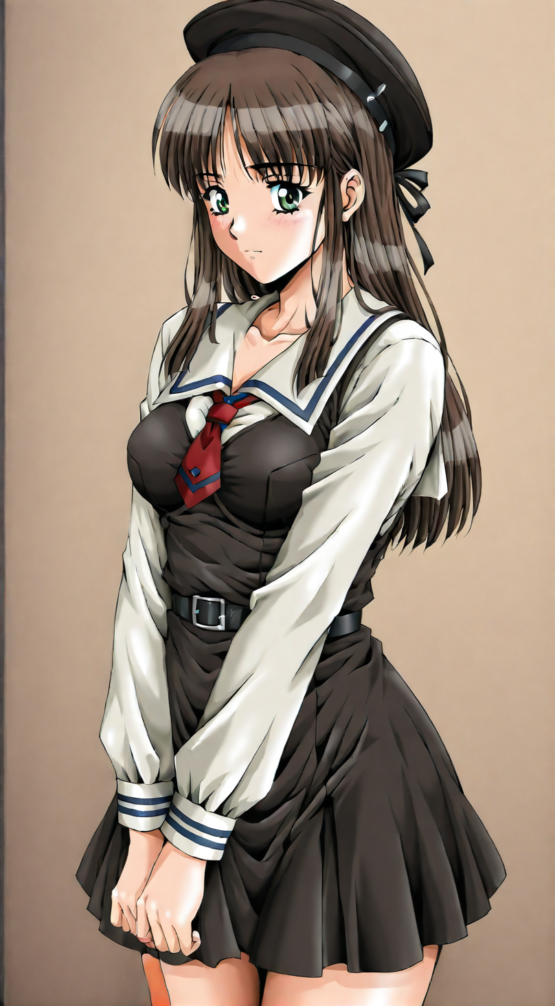 緑の目、帽子、長い髪、学校制服、ベレー帽、茶色の髪、長袖、セラフク、シャツ、スカート、